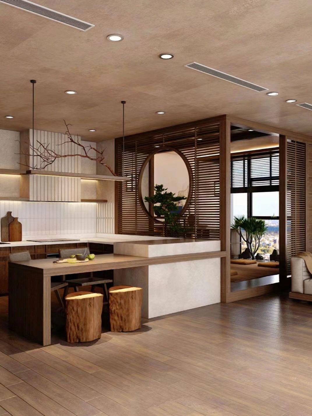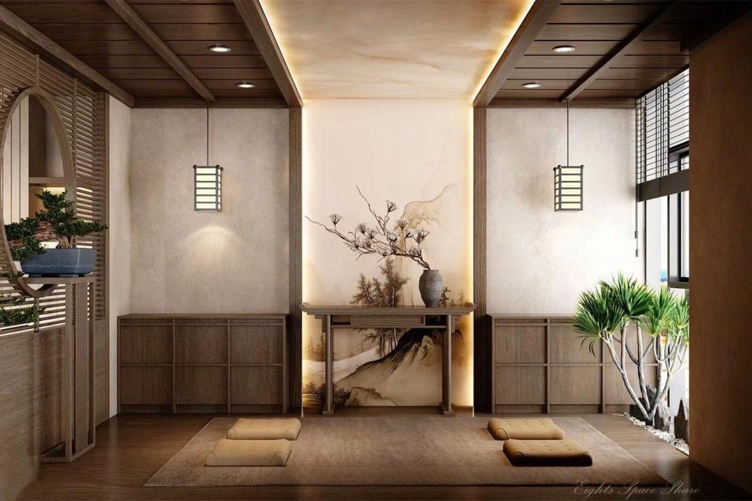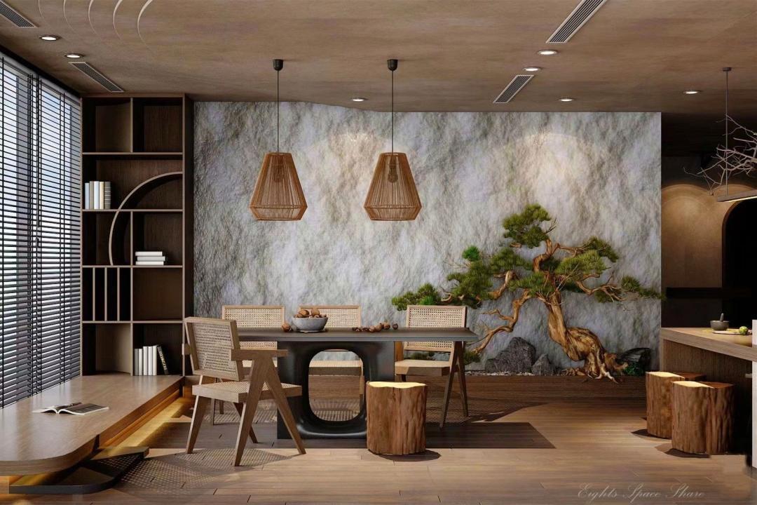 会客厅也就是茶室的背景墙以真实的假木为前景,石纹材质为后景,石纹材质营造出海浪的氛围,给予山水的想象,以石为水,材质为山,有山又有水。此茶室会客更是颇有意境,扫除都市生活的浮躁,以更纯粹的心境与亲朋好友畅谈,聊人生谈理想抱负,思想上的碰撞能带来更多的灵感与想法。